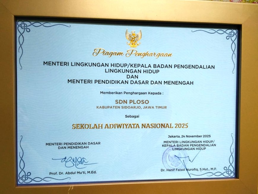 Penghargaan tersebut diterima secara langsung oleh Kepala SD Negeri Ploso, Ibu Suwatiningsih, pada acara penganugerahan Sekolah Adiwiyata Nasional yang diselenggarakan di Taman Mini Indonesia Indah (TMII), Jakarta, pada 11 Desember 2025.