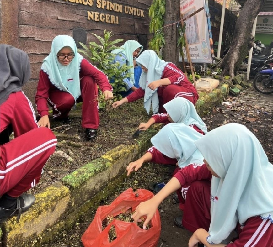 Peserta didik kelas VIII menunjukkan bentuk kerja sama yang baik dalam membereskan sampah- sampah yang tidak lagi digunakan. Sampah tersebut diklasifikasikan sesuai jenisnya, kemudian dikumpulkan dalam kantong plastik besar dan keranjang sampah yang telah disediakan. Selain itu, peserta didik kelas VIII juga melakukan penyiangan rumput liar yang tumbuh di taman depan kelas. Rumput liar yang sebelumnya membuat taman tampak kurang terawat berhasil dibersihkan, sehingga taman kembali terlihat rapi dan nyaman dipandang. Kegiatan ini mencerminkan adanya kesadaran peserta didik terhadap pentingnya menjaga keindahan lingkungan sekolah.