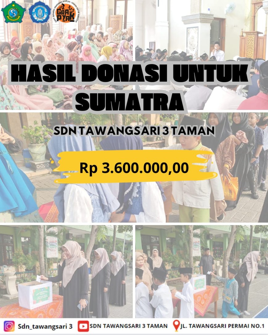 Berkat ketulusan para siswa, guru, dan wali murid, SDN Tawangsari 3 berhasil mengumpulkan donasi sebesar Rp3.600.000 (Tiga Juta Enam Ratus Ribu Rupiah). Nominal ini merupakan wujud nyata bahwa semangat gotong royong sangat kuat tertanam di lingkungan sekolah.
