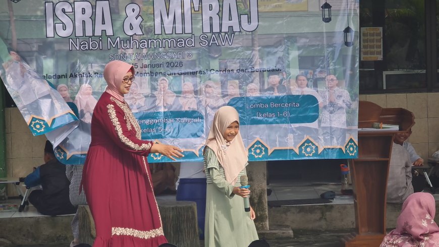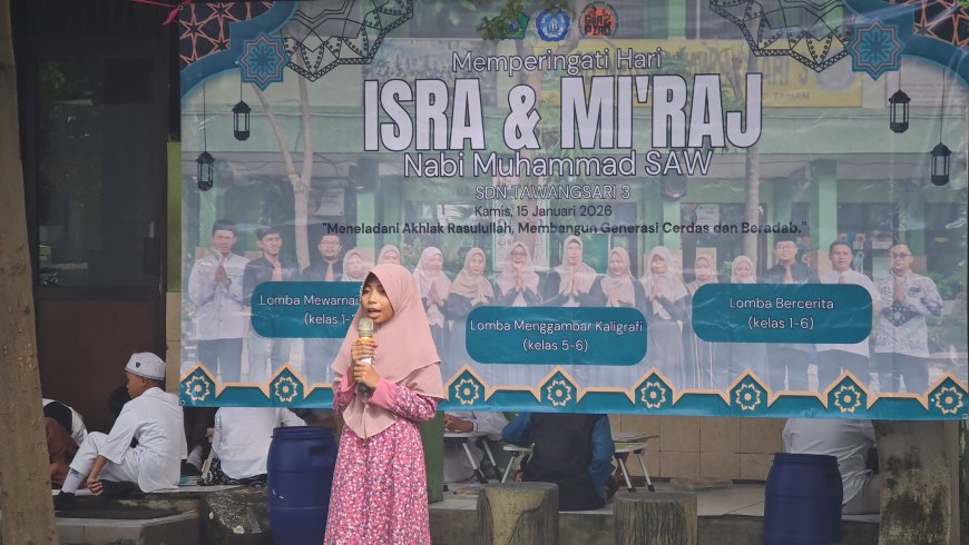 “SDN Tawangsari 3 memperingati Isra’ Mi’raj Nabi Muhammad SAW dengan berbagai lomba kreatif seperti mewarnai, kaligrafi, dan storyteller. Kegiatan berlangsung meriah di halaman sekolah dengan piala lomba sebagai kompetisi dan tumpeng jajan pasar sebagai wujud kebersamaan.”
