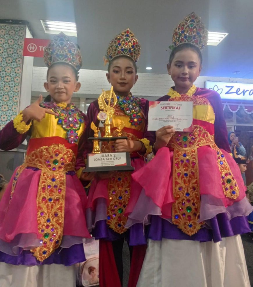 Prestasi lain datang dari tim Nayla (1B) dan Tsania (1A) yang memperoleh Juara 3 pada kategori tari grup A dengan membawakan Tari Pitik Walik. Tak ketinggalan, tim gabungan kelas atas — Fina (4B), Cua (5A), dan Shafa (5A) — turut menyumbang prestasi dengan meraih Juara 3 pada kategori tari grup C lewat penampilan Tari Tanjung Gumirang.